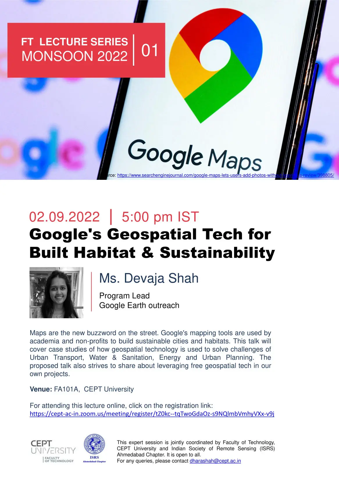 In the first expert session of this series, Ms. Devaja Shah, Program lead, Google Earth Outreach, was invited. The Faculty of Technology, CEPT University, and the Indian Society of Remote Sensing (ISRS) Ahmedabad chapter jointly coordinated the session. The session was held in hybrid mode so that the online audience could benefit from it.